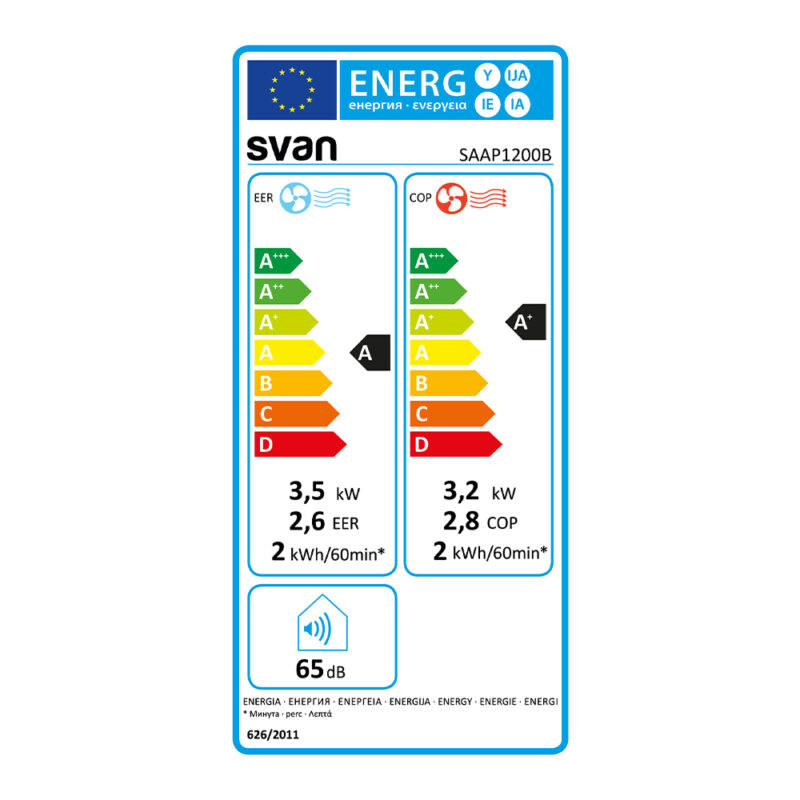 Aire con gas refrigerante R290, modo de funcionamiento frío y calor y capacidad de 12000 BTU. Eficiencia energética de refrigeración A y de calefacción A+. Nivel sonoro de 65 dB.