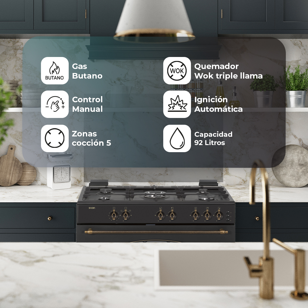 Cocina de gas ancho 90 cm de Svan modelo SKGW5900RN.