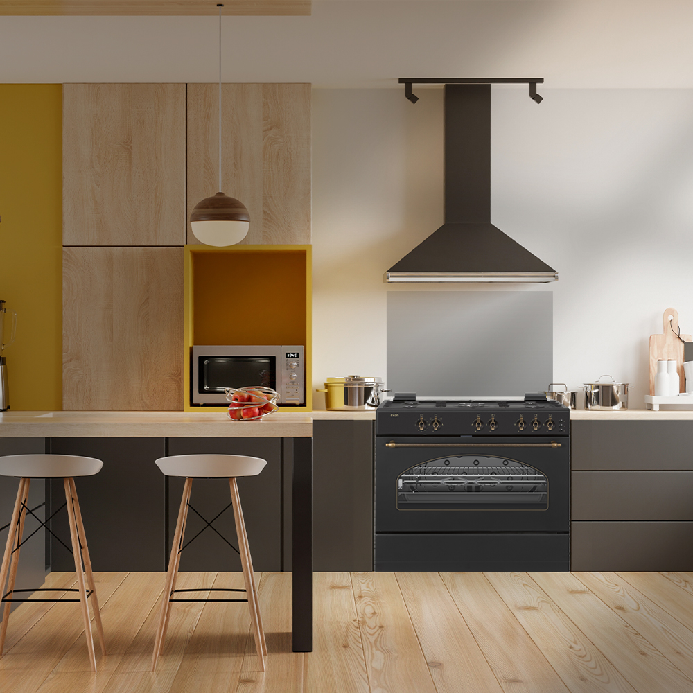 Estética rústica negra con tapa abatible de cristal y sistema de control manual con ignición automática.