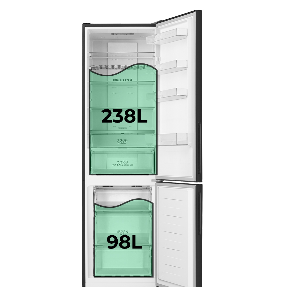 Capacidad total de 336 Litros, con congelador 4 estrellas y múltiples compartimentos para un óptimo almacenaje.
