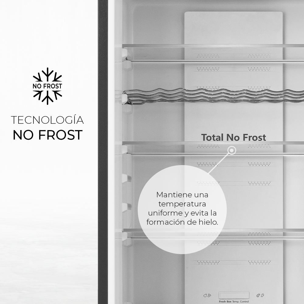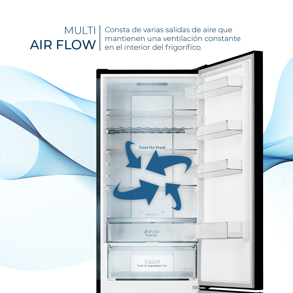– La tecnología No Frost garantiza una óptima conservación de los alimentos y evita la formación de hielo y escarcha en el frigorífico. Junto con la ventilación Multi Air Flow, consiguen una distribución uniforme en toda la cavidad y un enfriamiento más rápido.