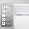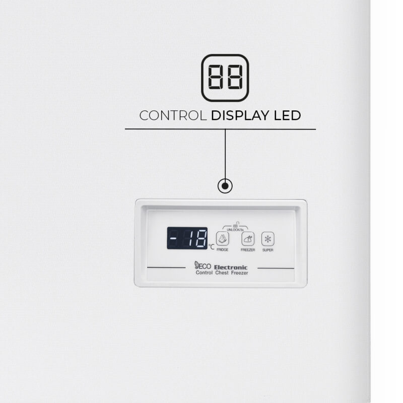 Estética blanca con 1 puerta de abertura con tirador. Sistema de control electrónico con Display LED, descongelación manual y funciones con las que sacar el mayor rendimiento al congelador.