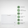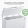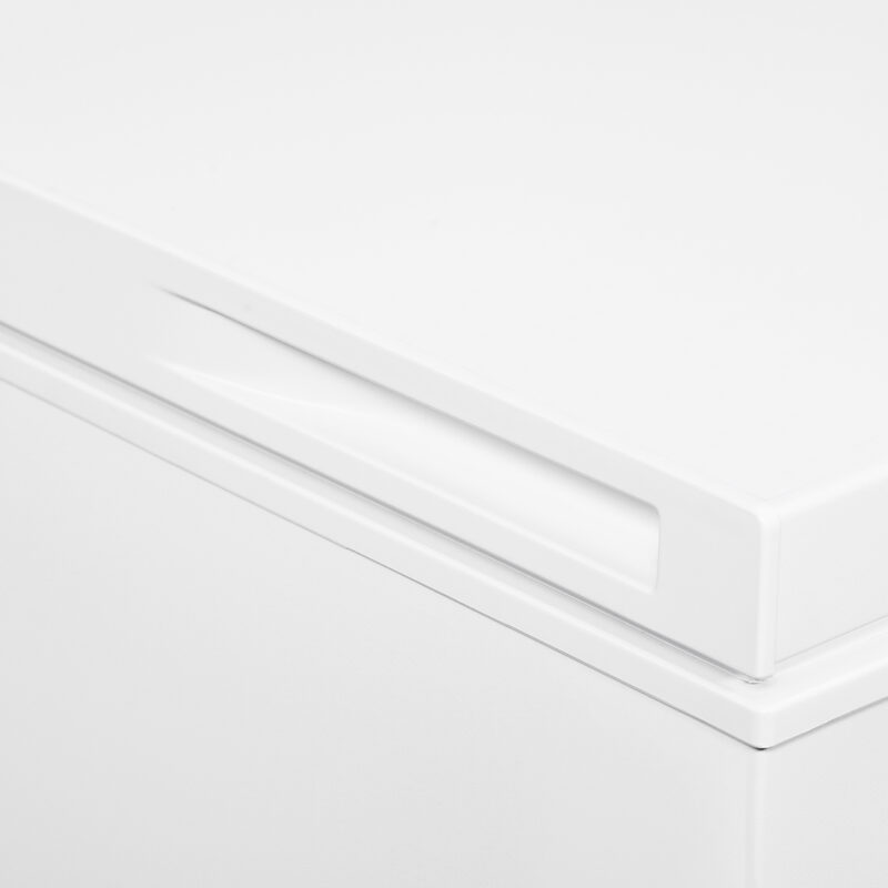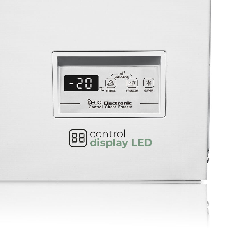 Estética blanca con 1 puerta de abertura con tirador. Sistema de control electrónico con Display LED, descongelación manual y funciones con las que sacar el mayor rendimiento al congelador.