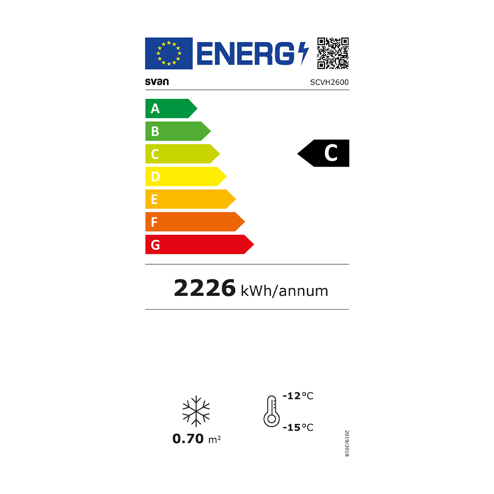 Congelador de tecnología No Frost, con motor motor universal y gas R290. Eficiencia energética C y nivel sonoro máximo de 70 dB.