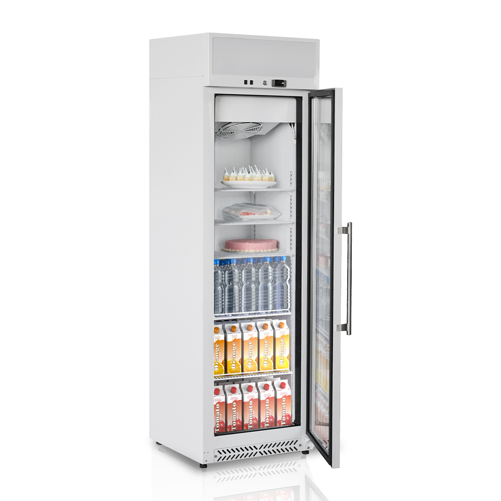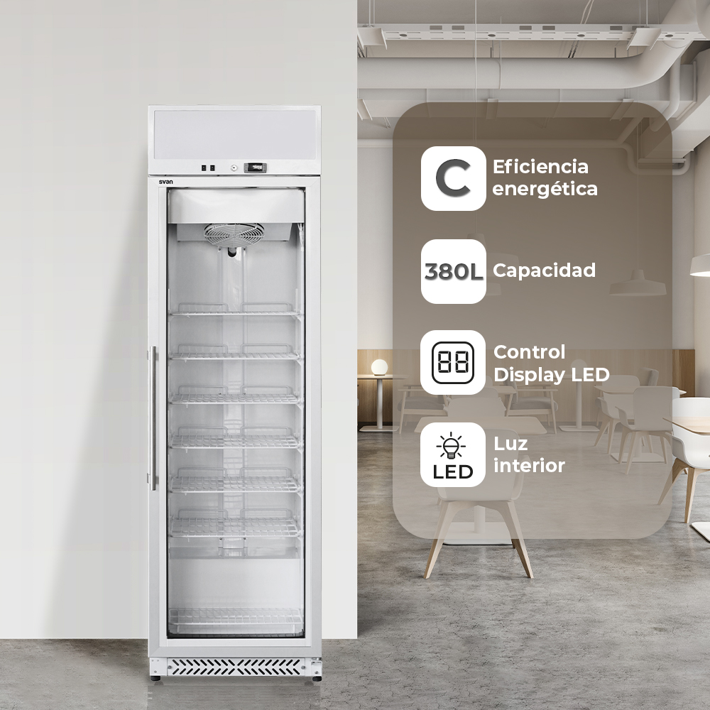 Estética blanca con 1 puerta no reversible de cristal de abertura con tirador. Iluminación interior LED y panel superior retroiluminado. Sistema de control electrónico con Display LED, descongelación auto y funciones con las que sacar el mayor rendimiento al congelador.