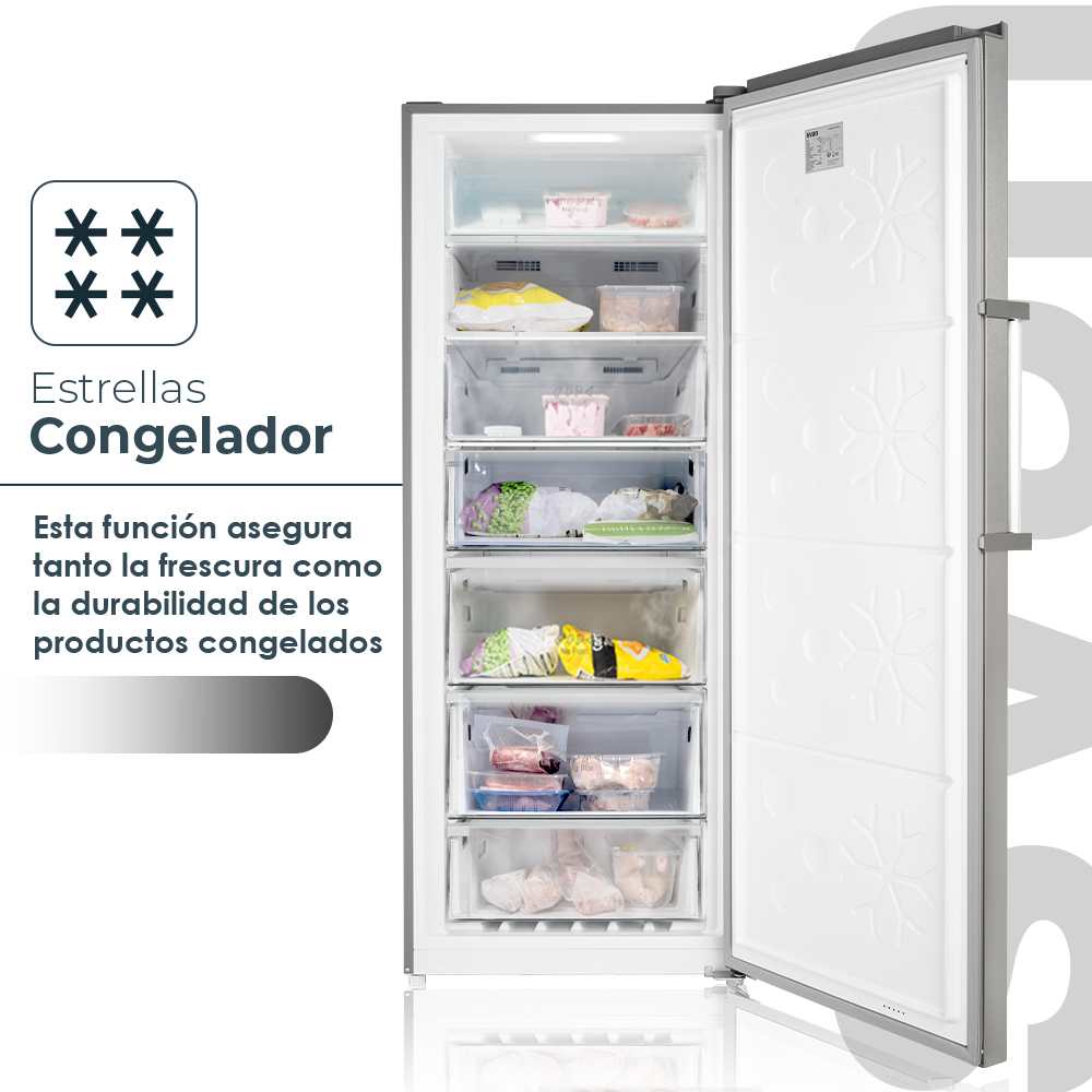 Congelador 4 estrellas de 380 Litros de capacidad con múltiples compartimentos para un óptimo almacenaje.