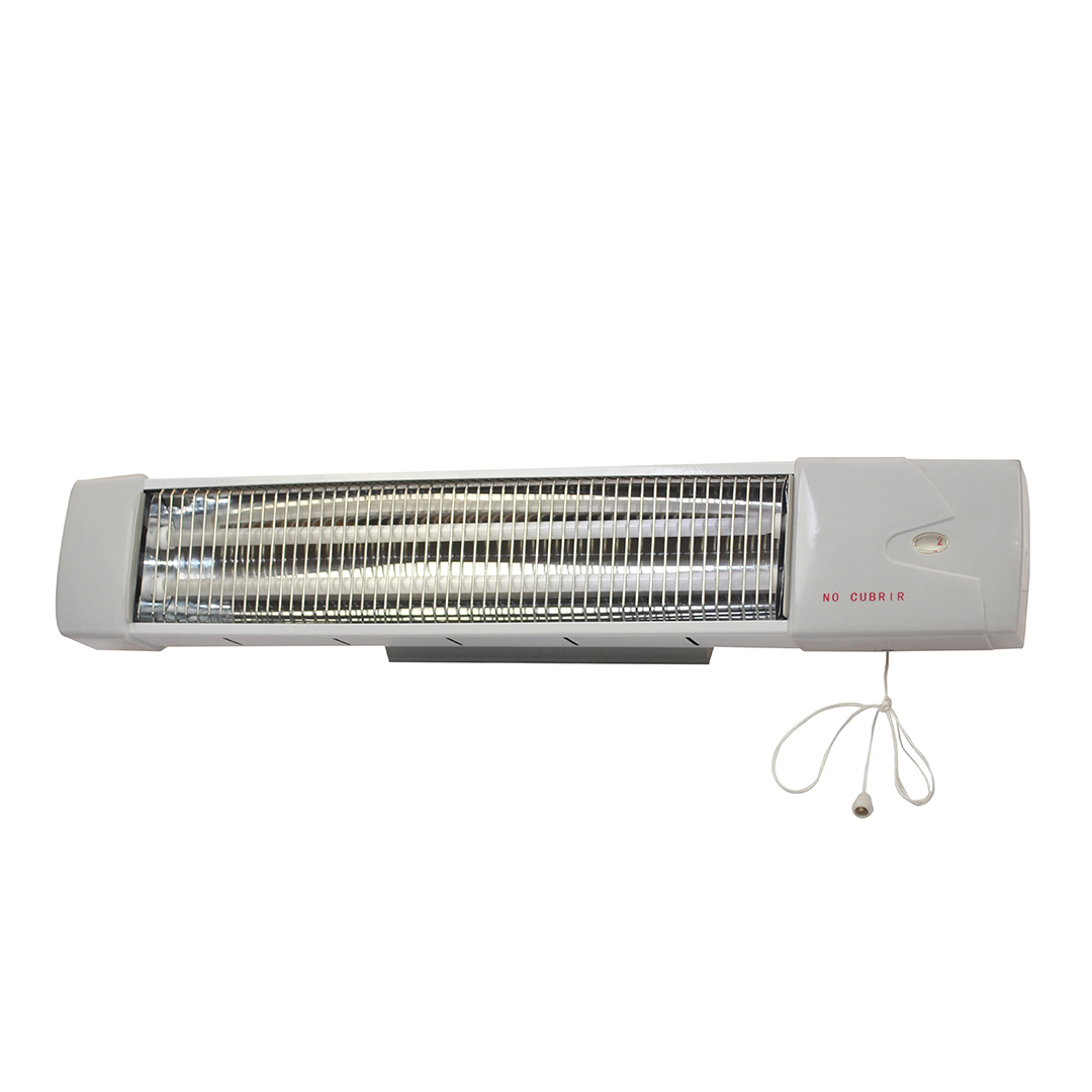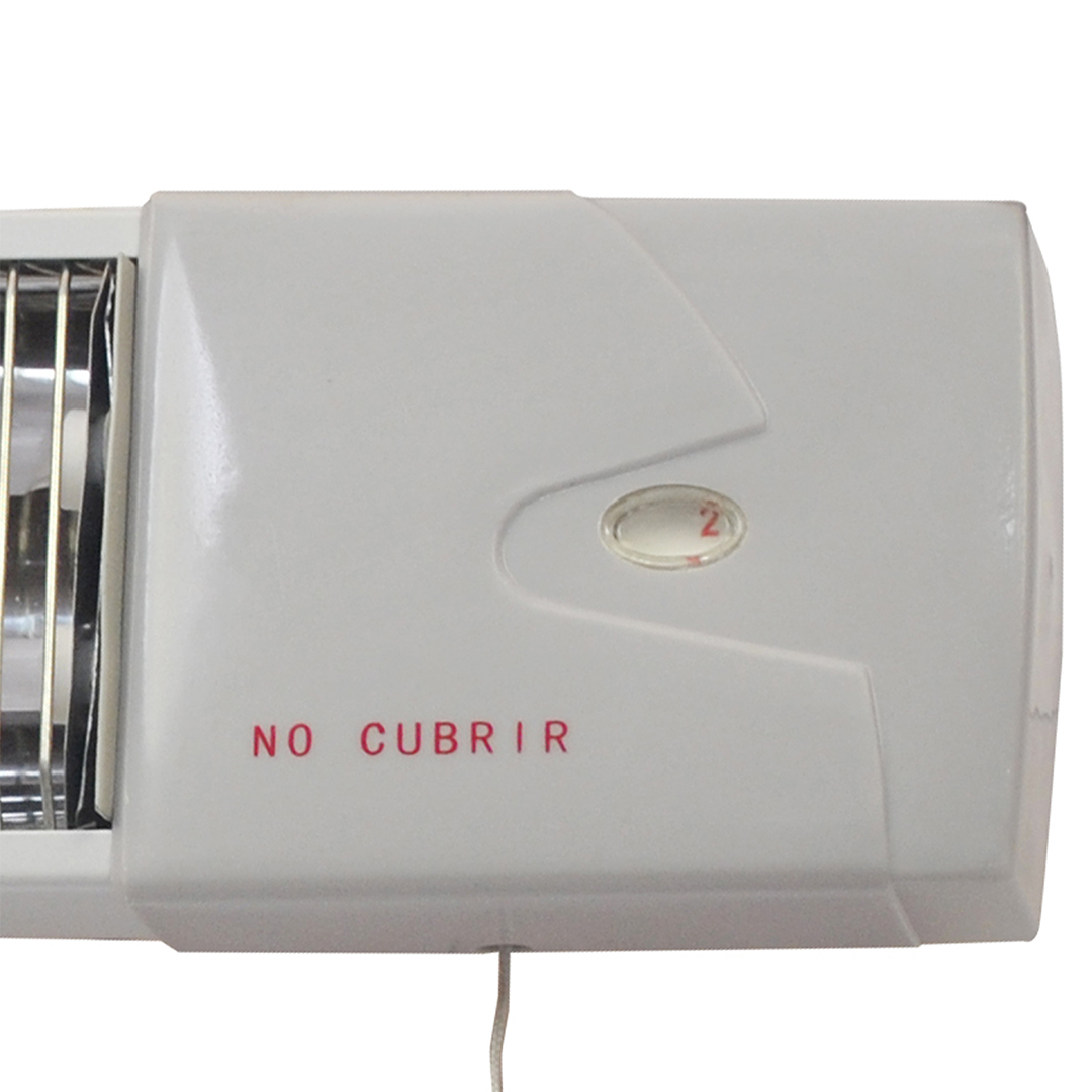 Estufa halógena de 1200 W de potencia. Incluye set de montaje para colgar en la pared.