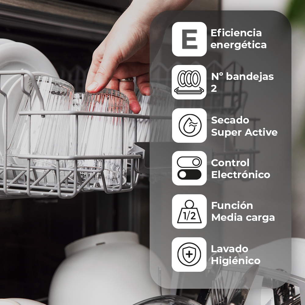 Esthétique blanche avec 2 plateaux et un panier à couverts. Système de contrôle électronique avec 5 programmes et fonctions de lavage pour garantir les meilleurs résultats et l'entretien de la vaisselle.