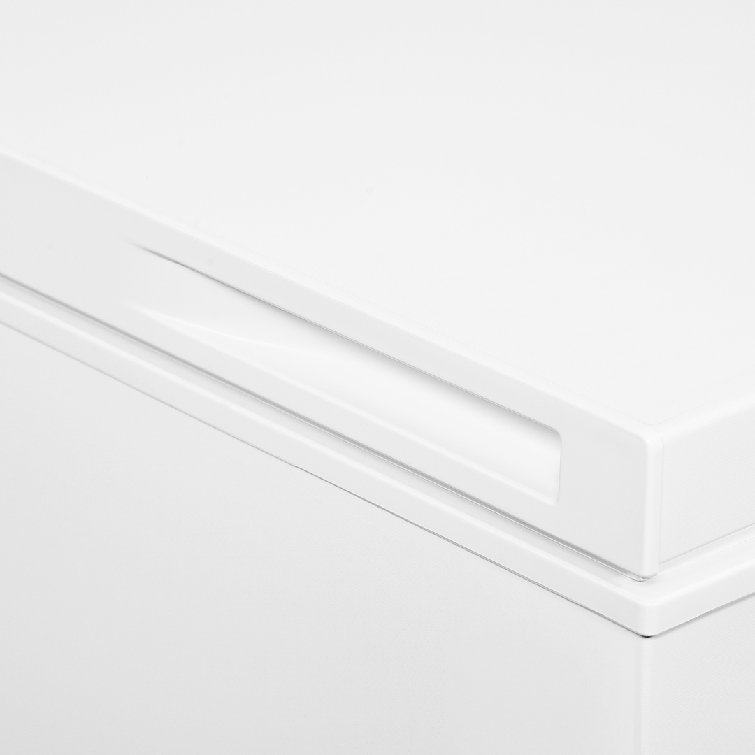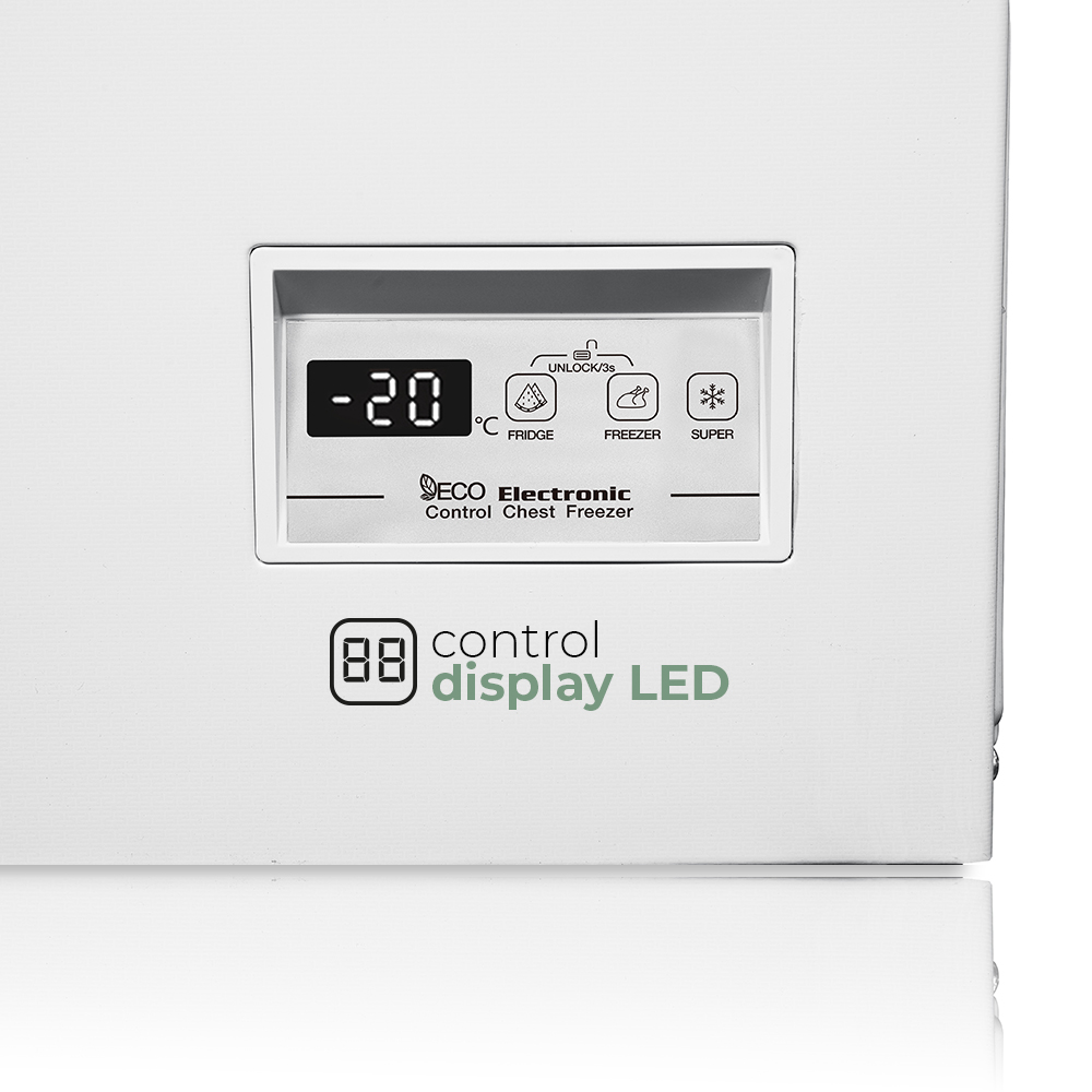 Esthétique blanche avec 1 porte ouvrante avec poignée. Système de contrôle électronique avec affichage LED, dégivrage manuel et fonctions pour tirer le meilleur parti du congélateur.