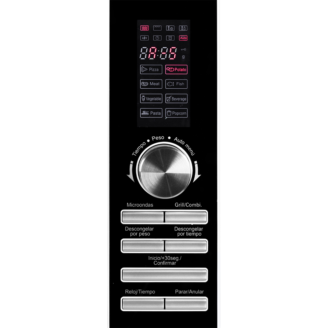 Esthétique noire avec porte en verre noir et ouverture avec poignée. Cavité émaillée blanche et plateau tournant en verre. Système de contrôle électronique avec affichage LED et minuterie numérique. Il offre 5 niveaux de puissance, le gril, 2 options de cuisson combinée et différentes fonctions pour obtenir les meilleures performances et faciliter le processus de cuisson.