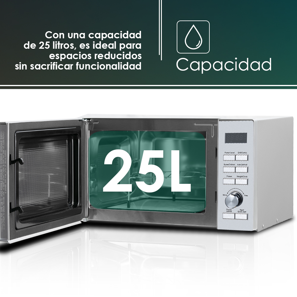 Esthétique en acier inoxydable avec porte en verre noir et ouverture avec poignée. Cavité en acier inoxydable avec éclairage LED et base en céramique, sans plaque de verre. Système de contrôle électronique avec affichage LED et minuterie numérique. Il offre 6 niveaux de puissance, le gril, 2 options de cuisson combinée et différentes fonctions pour obtenir les meilleures performances et faciliter le processus de cuisson.