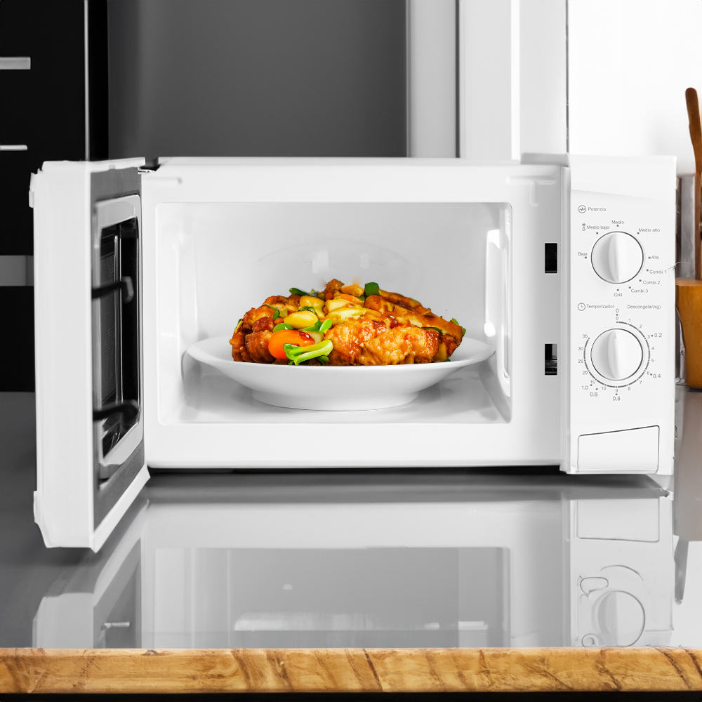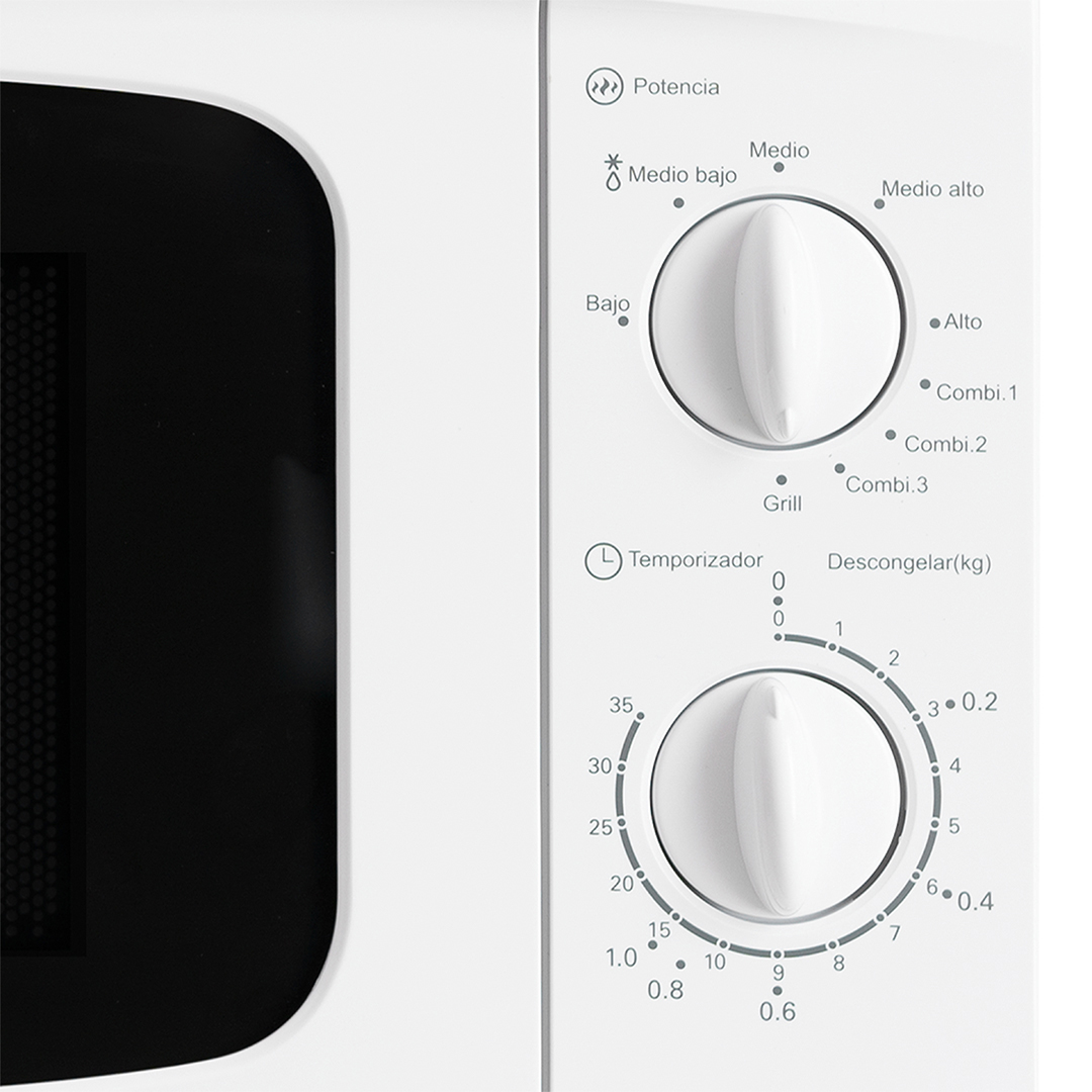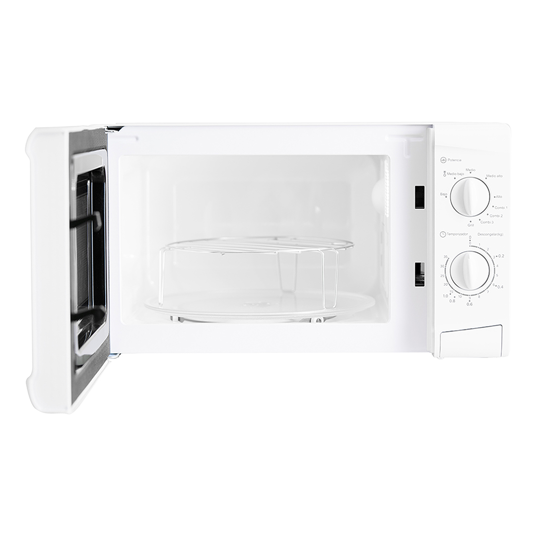 Esthétique blanche avec porte blanche et ouverture par bouton poussoir. Cavité émaillée blanche avec éclairage LED et plateau tournant en verre. Système de contrôle manuel et minuterie mécanique. Il offre 5 niveaux de puissance, le gril, 3 options de cuisson combinée et différentes fonctions pour obtenir les meilleures performances et faciliter le processus de cuisson.