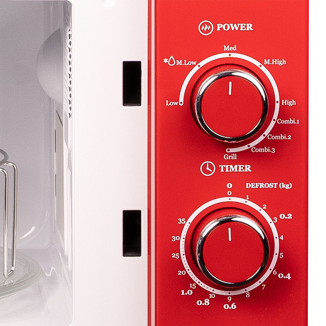 Esthétique rétro rouge avec porte et poignée d'ouverture rouges. Cavité émaillée blanche avec éclairage LED et plateau tournant en verre. Système de contrôle manuel et minuterie mécanique. Il offre 5 niveaux de puissance, le gril, 3 options de cuisson combinée et différentes fonctions pour obtenir les meilleures performances et faciliter le processus de cuisson.
