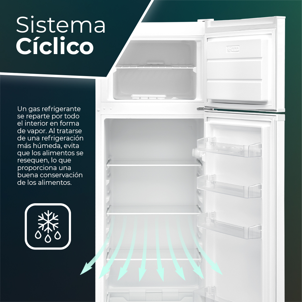 Réfrigérateur à technologie cyclique, avec moteur universel et gaz R600a. Efficacité énergétique E et niveau sonore maximum de 40 dB.