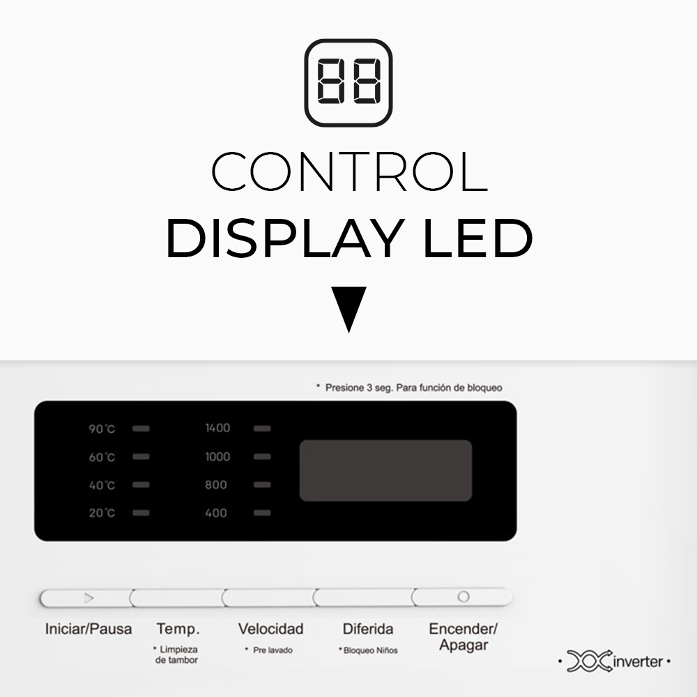 Esthétique blanche avec porte foncée, tambour en acier inoxydable. Système de contrôle électronique avec écran LED et 12 programmes et fonctions de lavage pour garantir les meilleurs résultats et l'entretien de votre linge.
