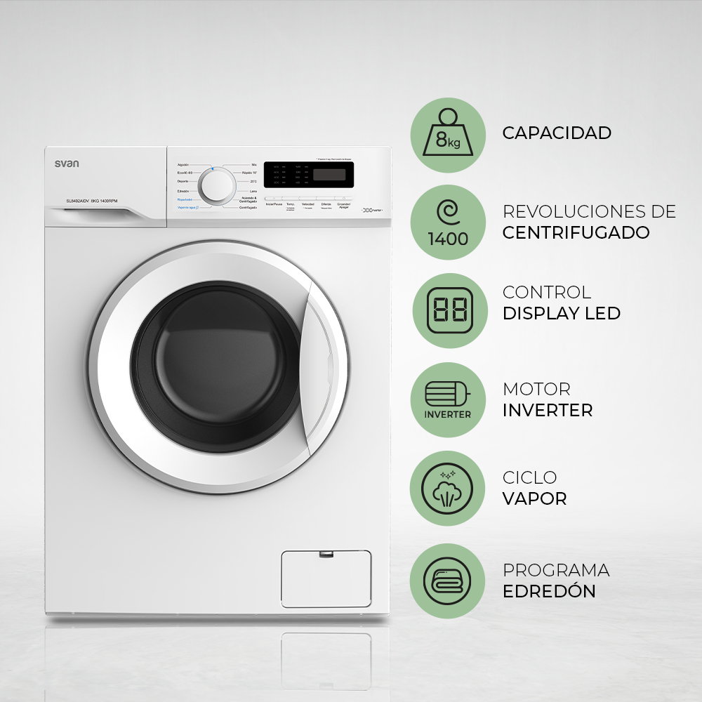 Lave-linge Svan 8kg 1400rpm A 85cm 59,5cm 51cm Blanc Inverter Vapeur Affichage
