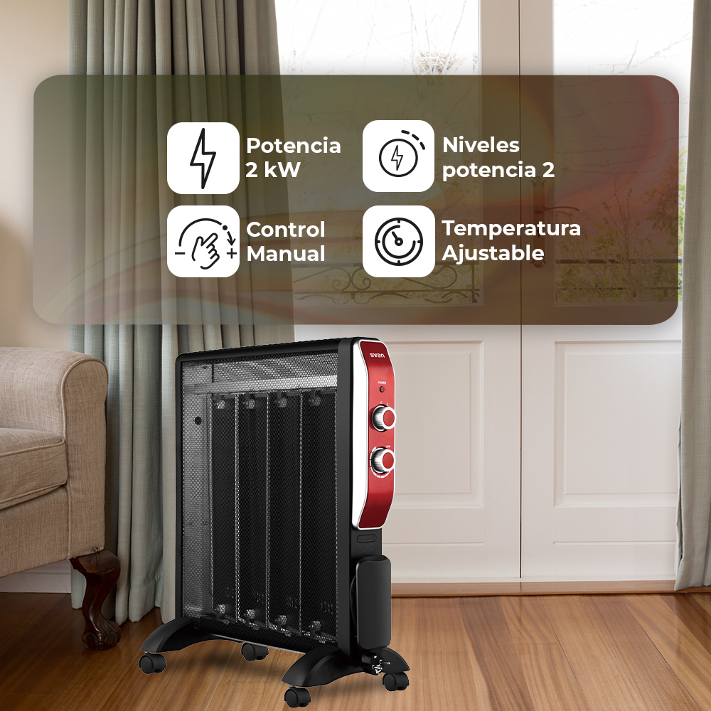Esthétique rouge avec roues de support et compartiment de rangement des câbles. Système de contrôle manuel, avec 2 niveaux de fonctionnement et thermostat réglable. Il est équipé d'un capteur anti-basculement.