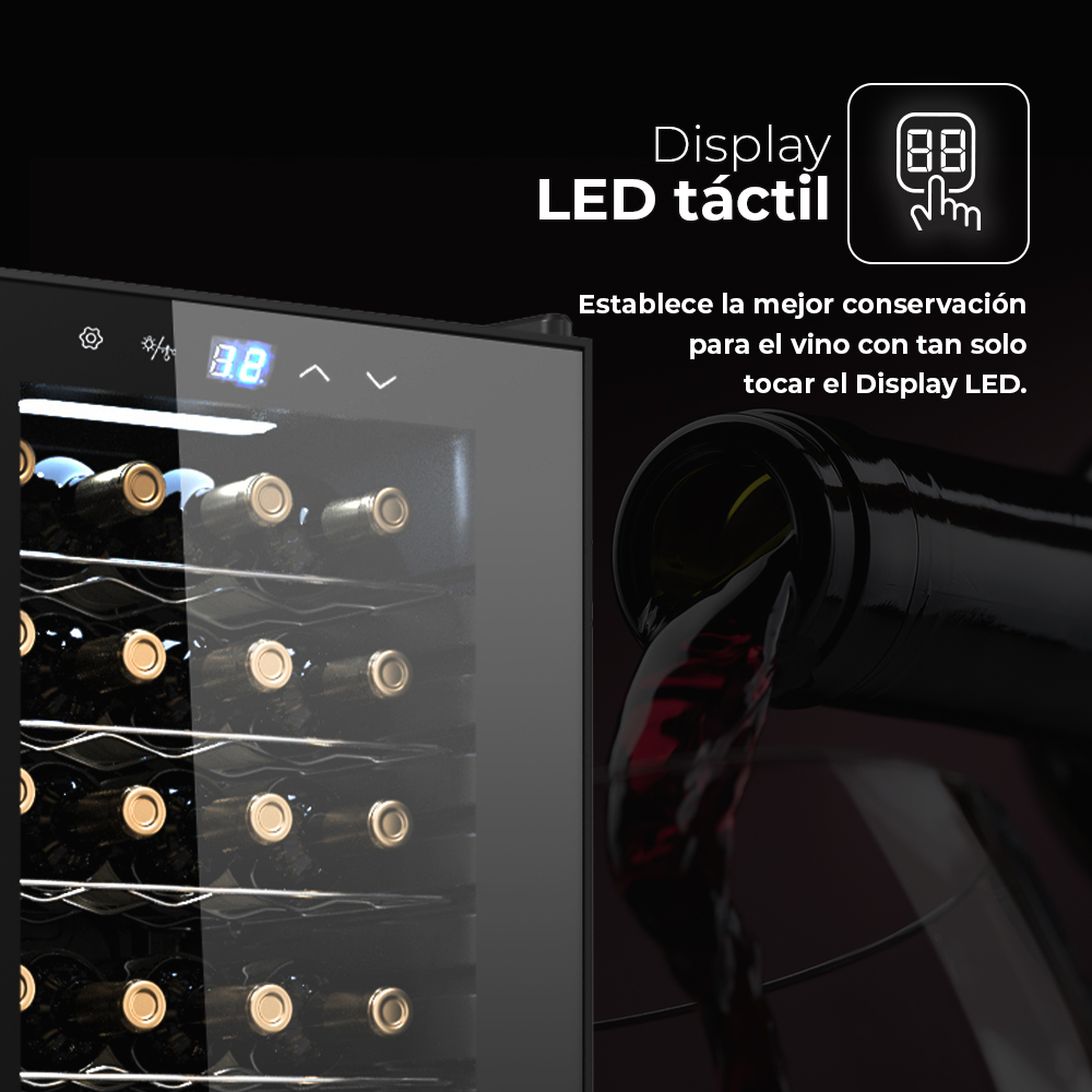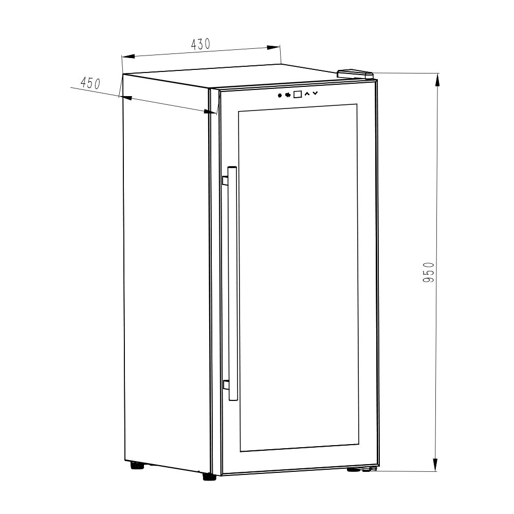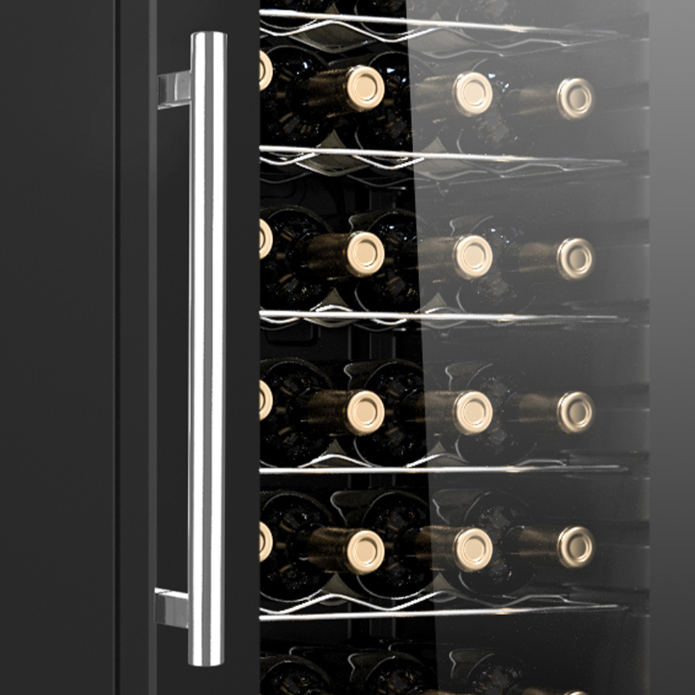 Esthétique noire avec 1 porte en verre à ouverture réversible avec poignée. Une seule zone de température. Système de commande tactile avec écran LED et éclairage intérieur LED.