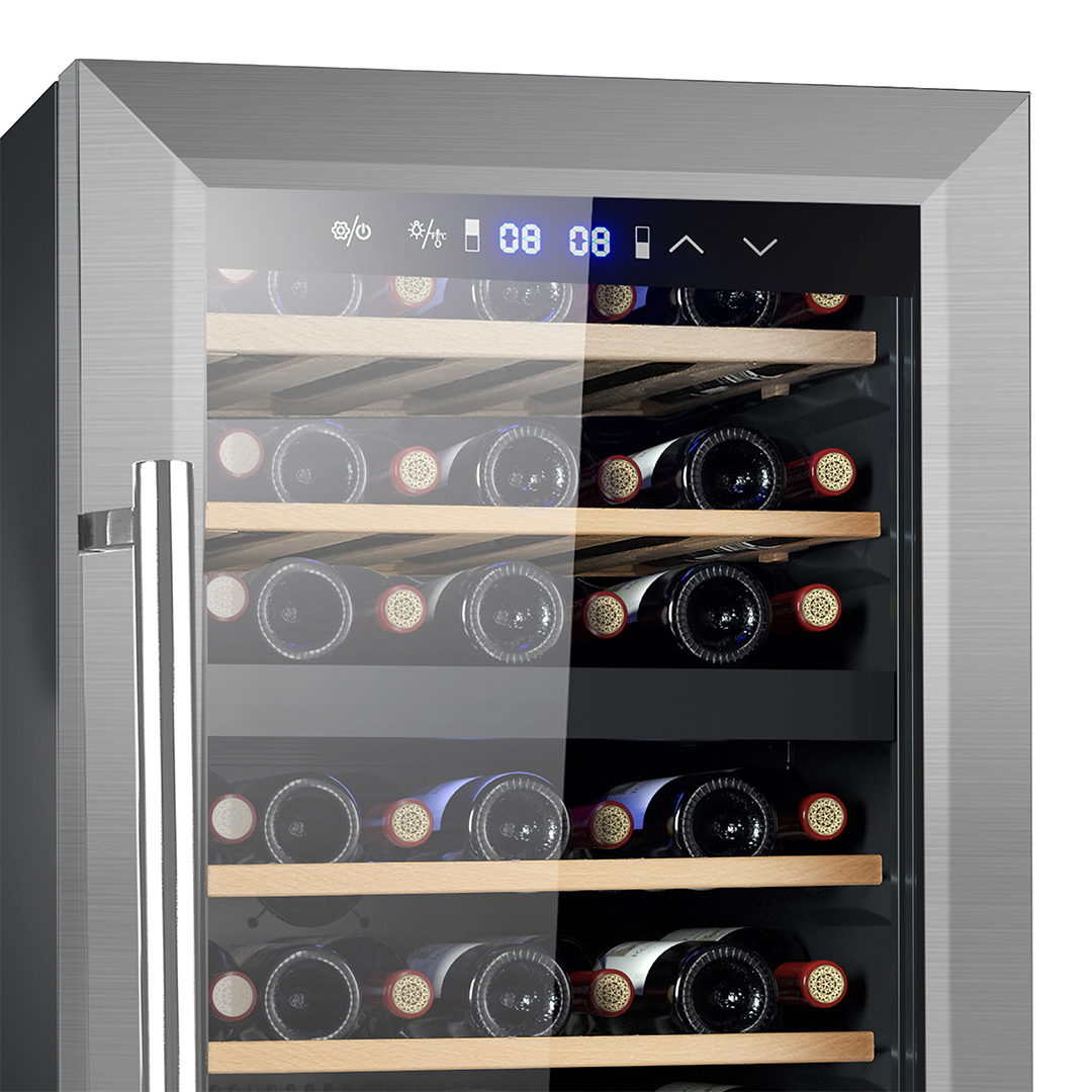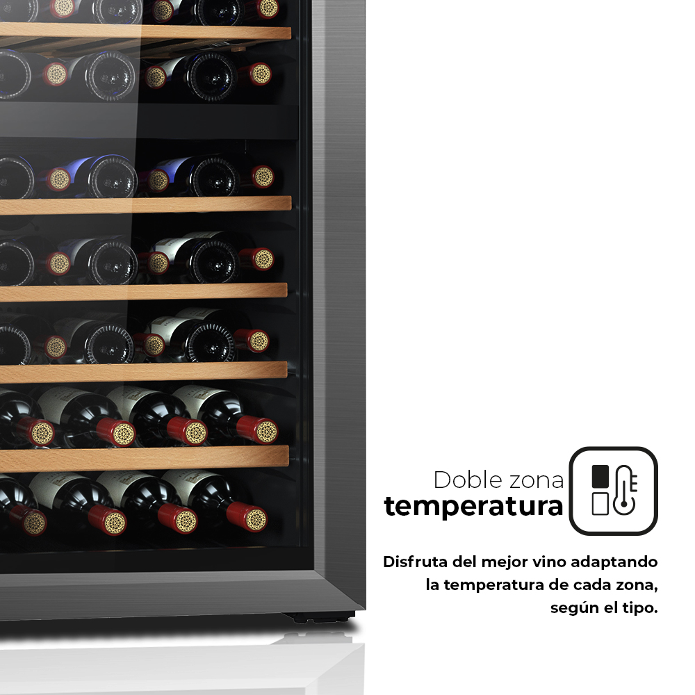 Esthétique noire avec 1 porte en verre à ouverture non réversible avec poignée. Double zone de température. Système de commande tactile avec écran LED et éclairage intérieur LED.
