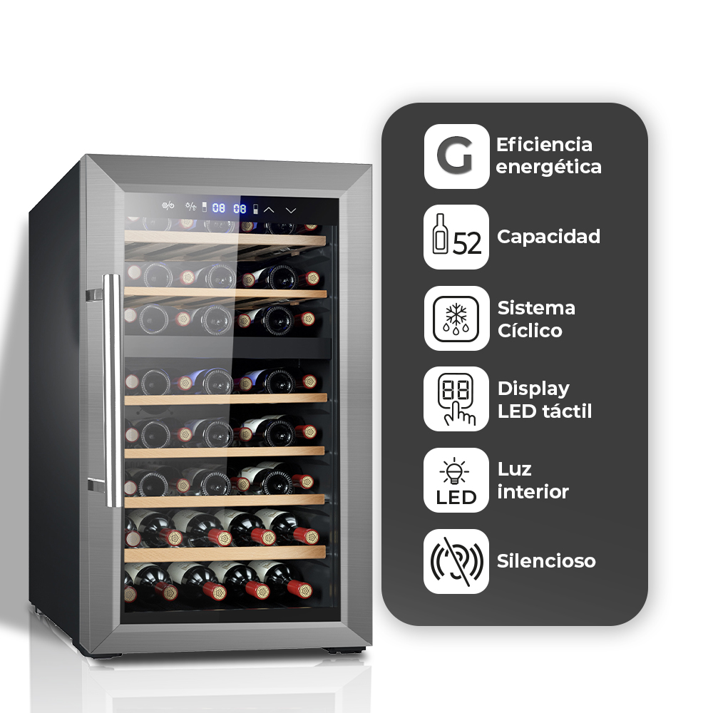 Refroidisseur de vin à technologie cyclique, avec moteur universel et gaz R600a. Efficacité énergétique G et niveau sonore maximum de 39 dB.