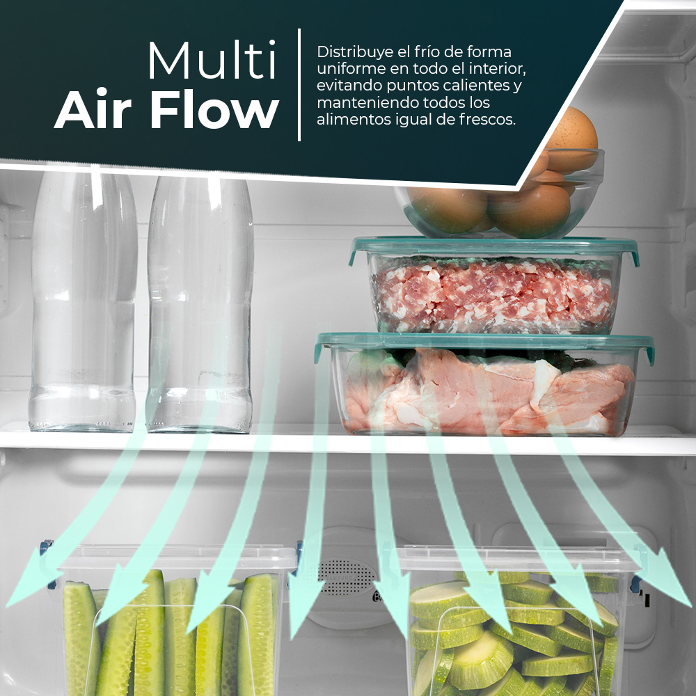 – La tecnología No Frost garantiza una óptima conservación de los alimentos y evita la formación de hielo y escarcha en el frigorífico. Junto con la ventilación Multi Air Flow, consiguen una distribución uniforme en toda la cavidad y un enfriamiento más rápido.