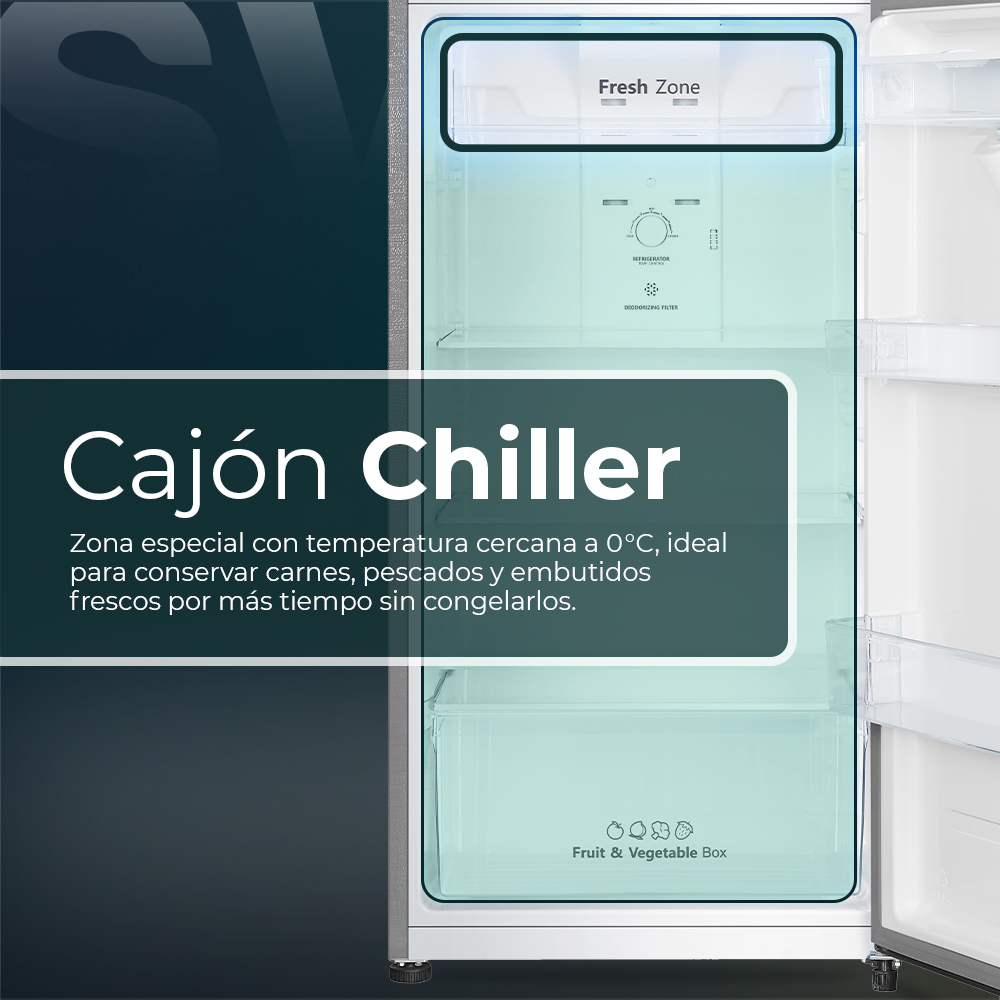 – El compartimento Chiller es ideal para carnes y pescados. En su interior, mantiene una temperatura inferior a la del resto de la cavidad para mantener estos alimentos más frescos durante más tiempo.
