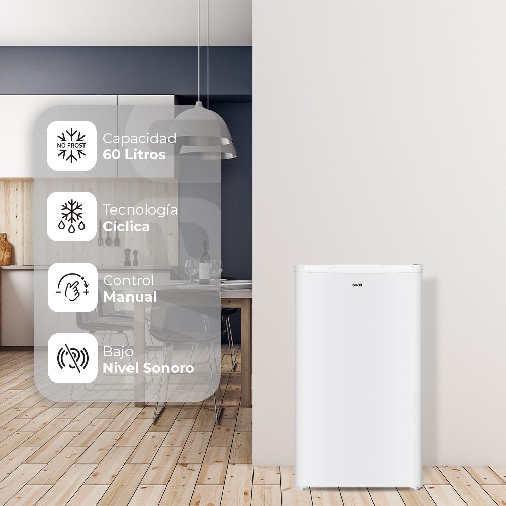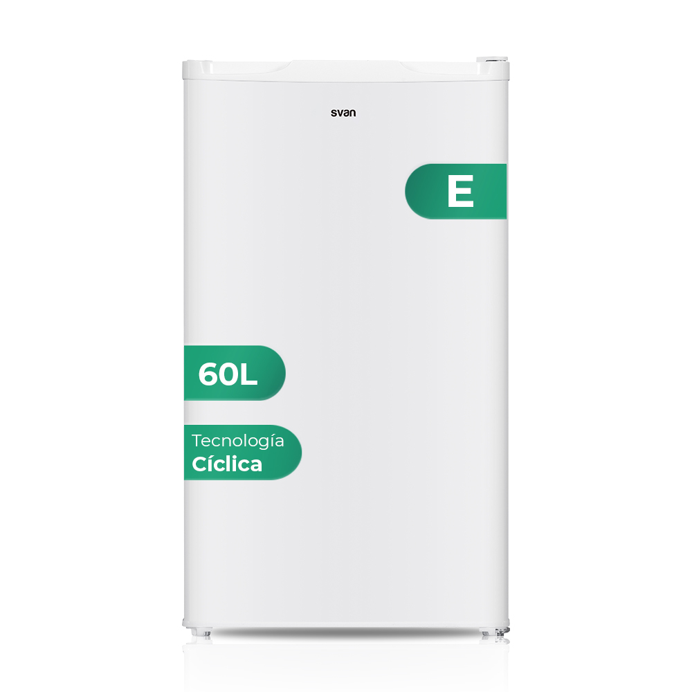 Congelatore verticale Svan, ciclico. Capacità 60L, Classe E. Dimensioni: 84,5 cm 48 cm 45 cm. Colore: Bianco, Controllo manuale.
