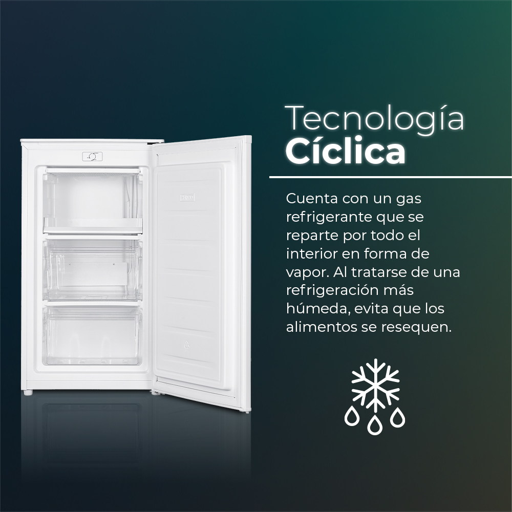 Estetica bianca con 1 porta reversibile con apertura a scanalatura. Sistema di controllo manuale, sbrinamento manuale e funzioni per ottenere il massimo dal congelatore.