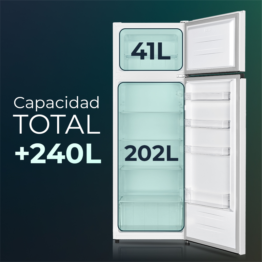 Capacità totale di 243 litri, con congelatore a 4 stelle e scomparti multipli per una conservazione ottimale.