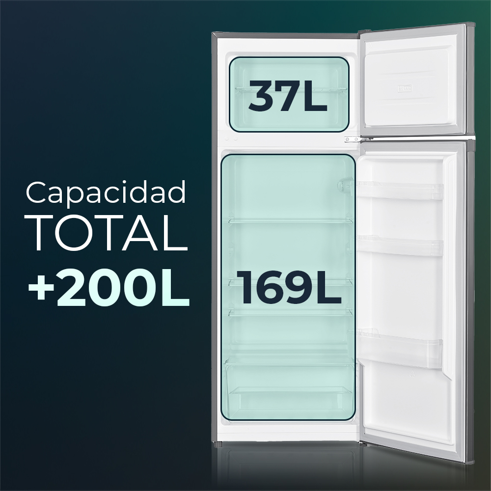 Capacità totale 206 litri, con congelatore a 4 stelle e scomparti multipli per una conservazione ottimale.