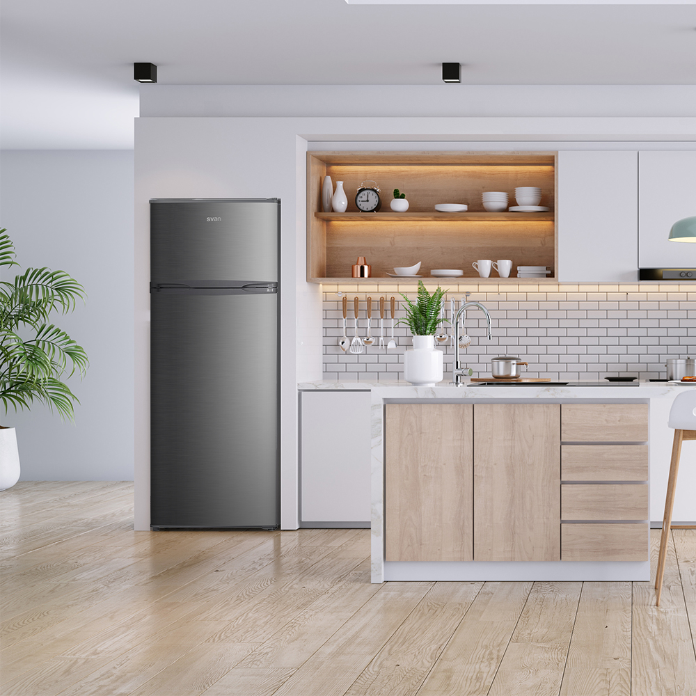 Frigorifero 2 porte Svan, Ciclico. Classe E. Dimensioni: 143cm 55cm 56cm. Colore acciaio inox, controllo manuale.