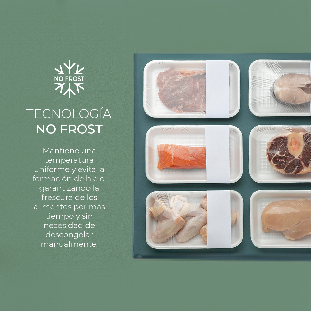 – La Tecnologia No Frost garantisce la conservazione ottimale degli alimenti e previene la formazione di ghiaccio e brina nel frigorifero.
