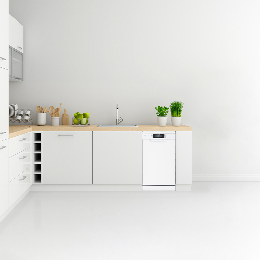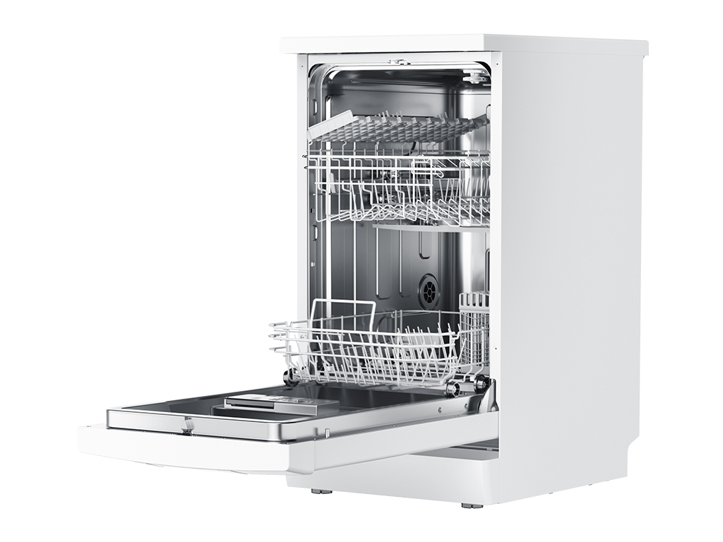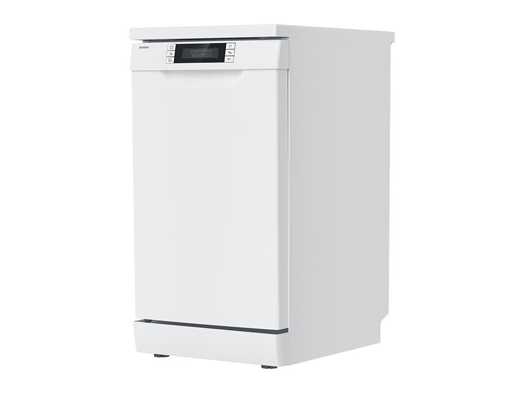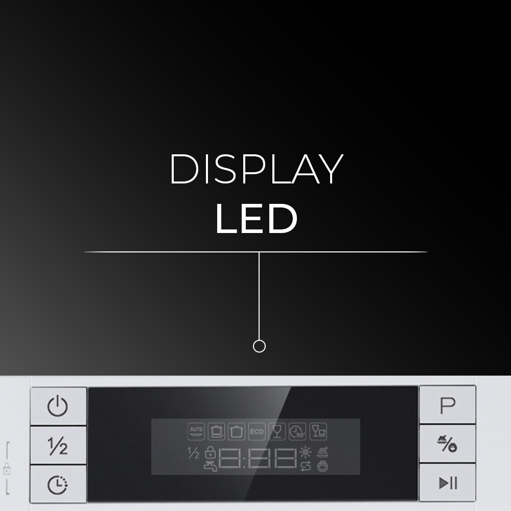 Estetica bianca con 2 vassoi e cestello portaposate. Sistema di controllo elettronico con display a LED con 7 programmi di lavaggio e funzioni per garantire i migliori risultati e la cura delle stoviglie.