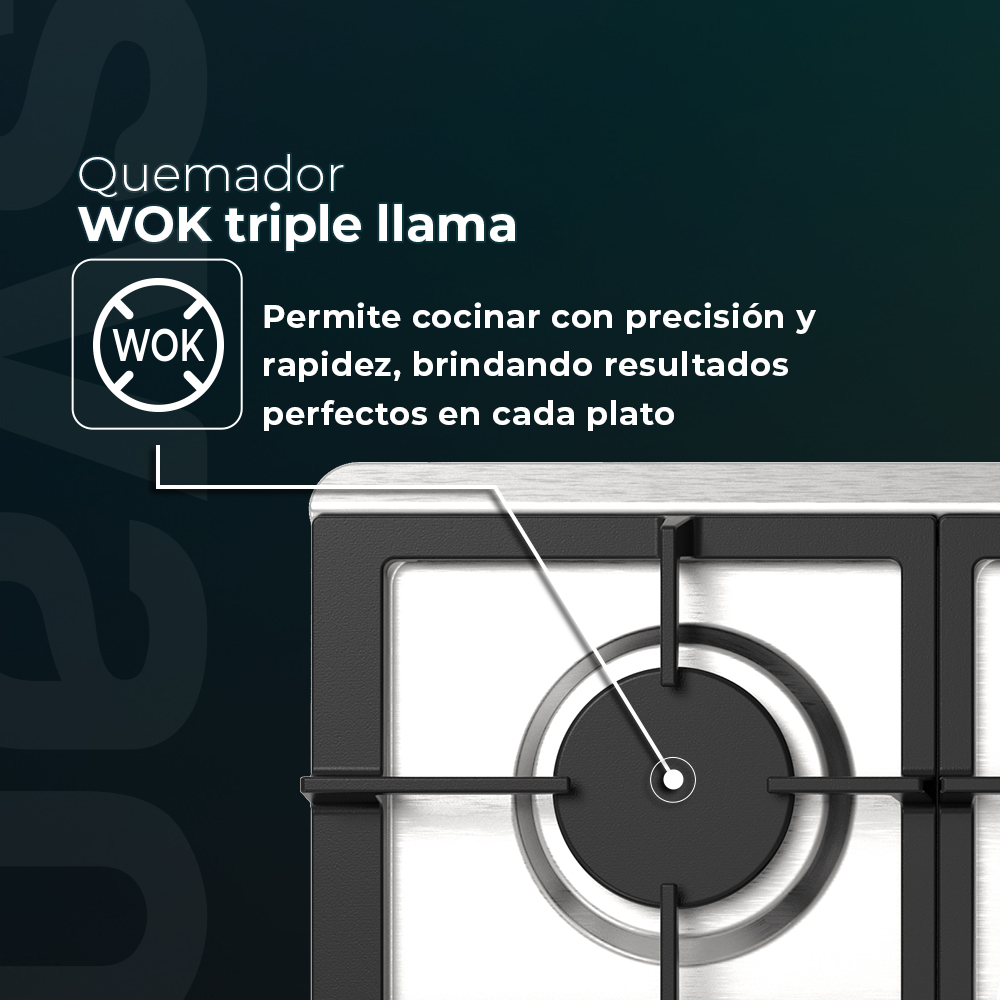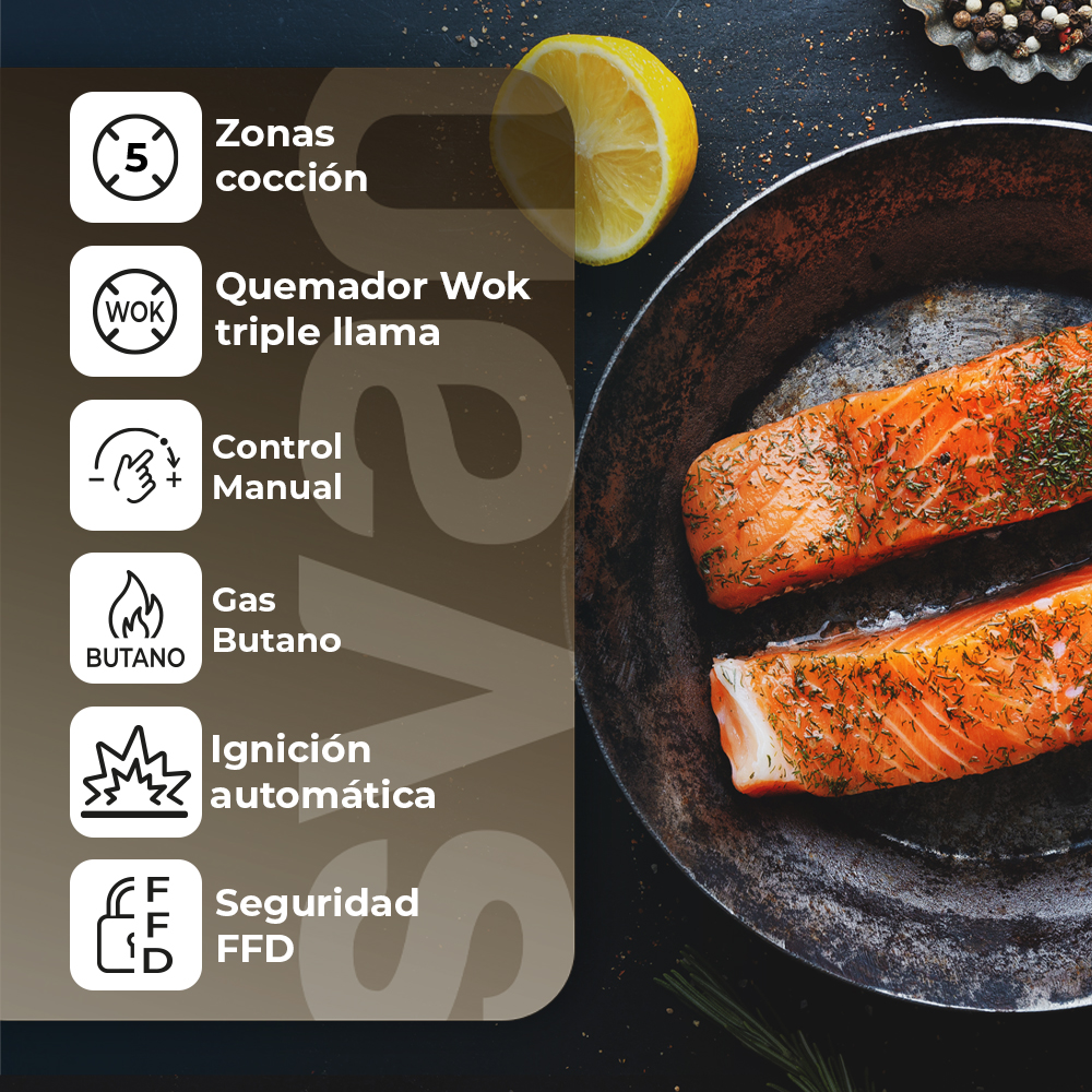 Piano di cottura pronto a gas butano con una potenza totale di W. Dispone di 5 bruciatori di diverse dimensioni, uno dei quali è un bruciatore WOK a tripla fiamma.