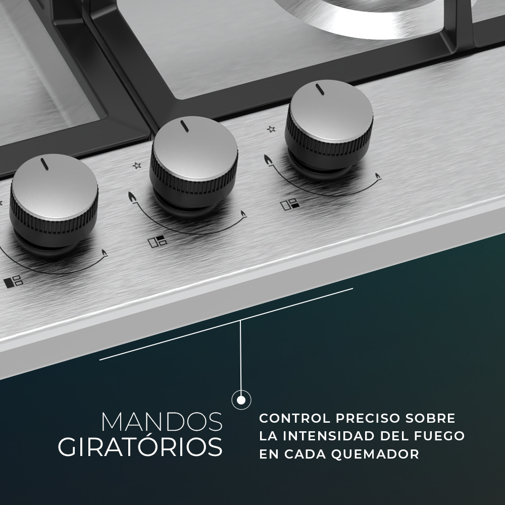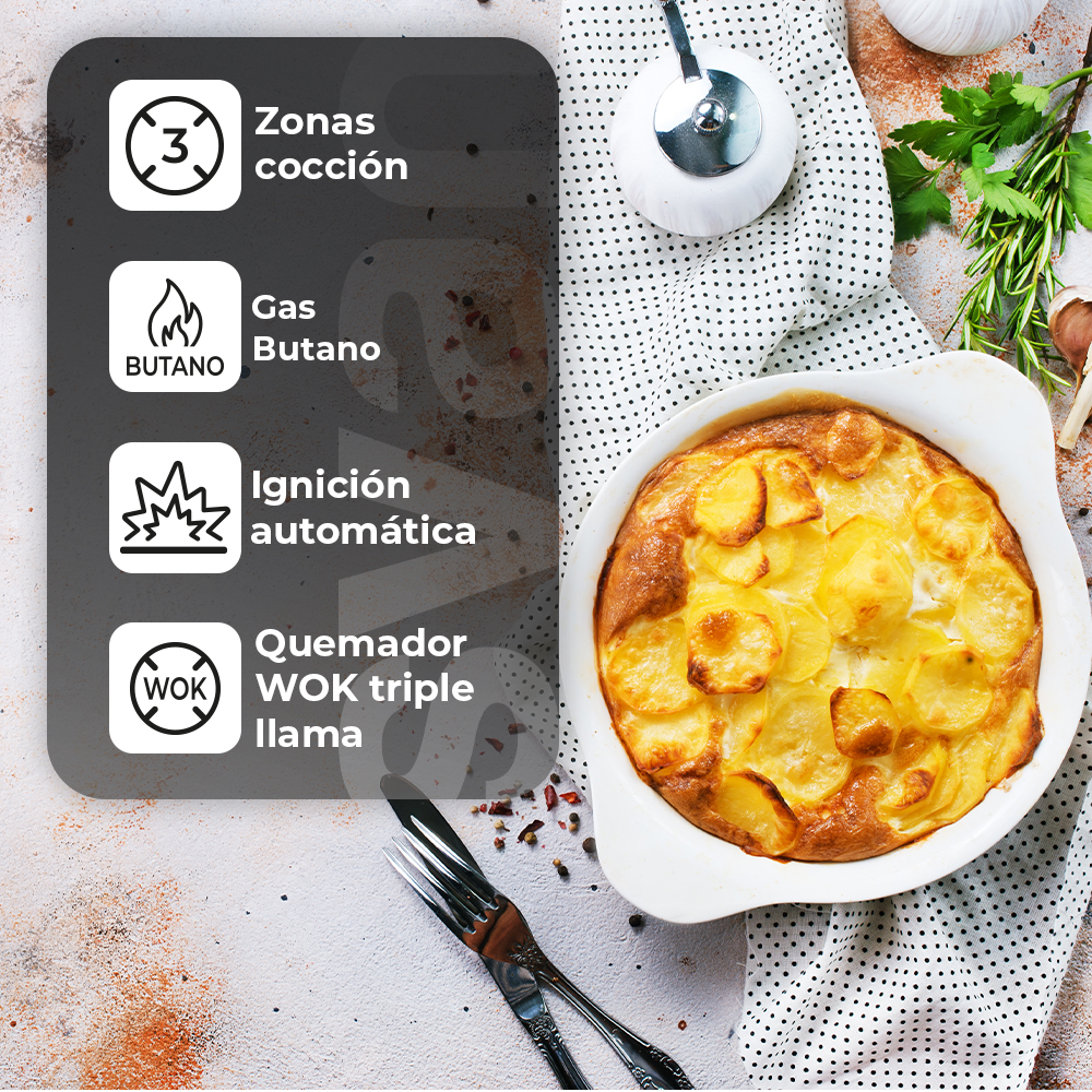 Piano cottura predisposto per il gas butano con una potenza totale di 6750 W. Include il kit di conversione a gas di città. Dispone di 3 bruciatori di diverse dimensioni, uno dei quali è un bruciatore WOK a tripla fiamma.