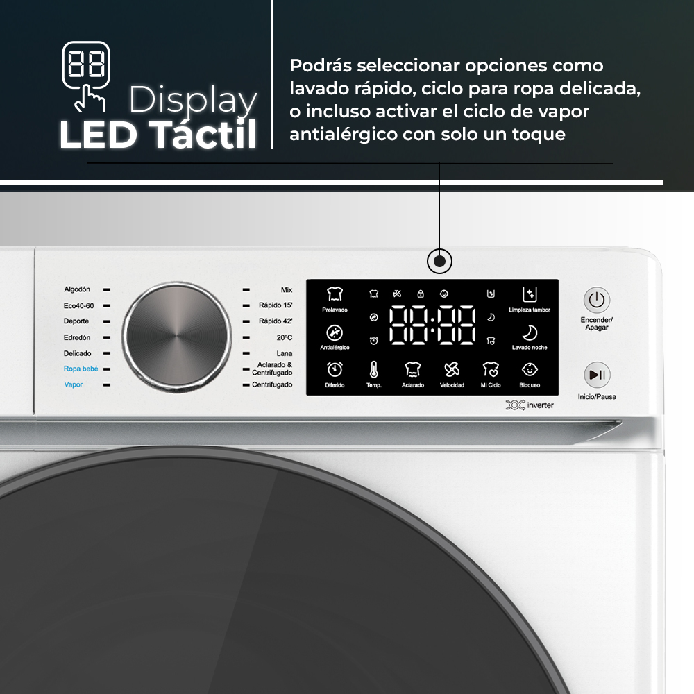 Estética blanca con puerta XXL oscura, tambor de acero inoxidable con superficie diamante. Sistema de control táctil con Display LED con 14 programas de lavado y funciones para garantizar el mejor resultado y cuidado en tu colada.