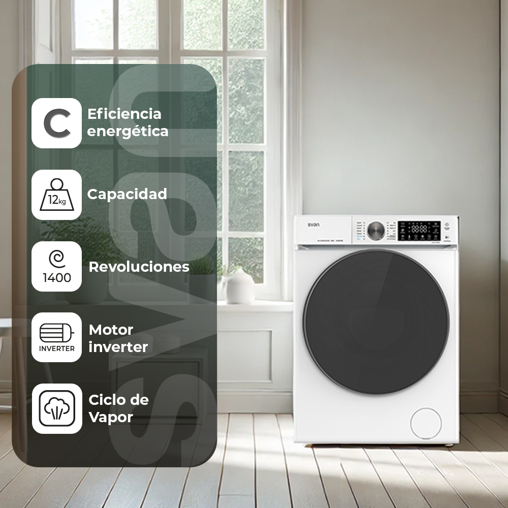 Lavadora Svan 12kg 1400rpm C 85cm 59,5cm 64cm Blanco Display táctil Inverter Vapor T.Diamante