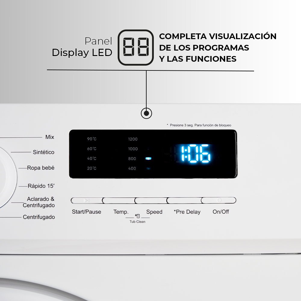 Estética blanca con puerta transparente, tambor de acero inoxidable con superficie diamante. Sistema de control electrónico con Display LED con 12 programas de lavado y funciones para garantizar el mejor resultado y cuidado en tu colada.
