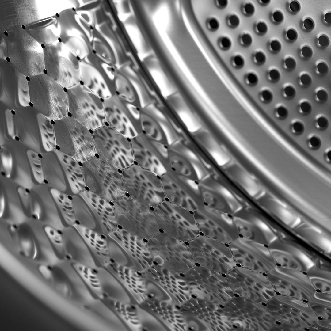 – El tambor con superficie diamante proporciona una mayor protección y delicadeza en cada lavado. Al disponer de menos orificios y de pequeños relieves se evita el desgaste o posibles enganches en las prendas, prolongando su vida útil.