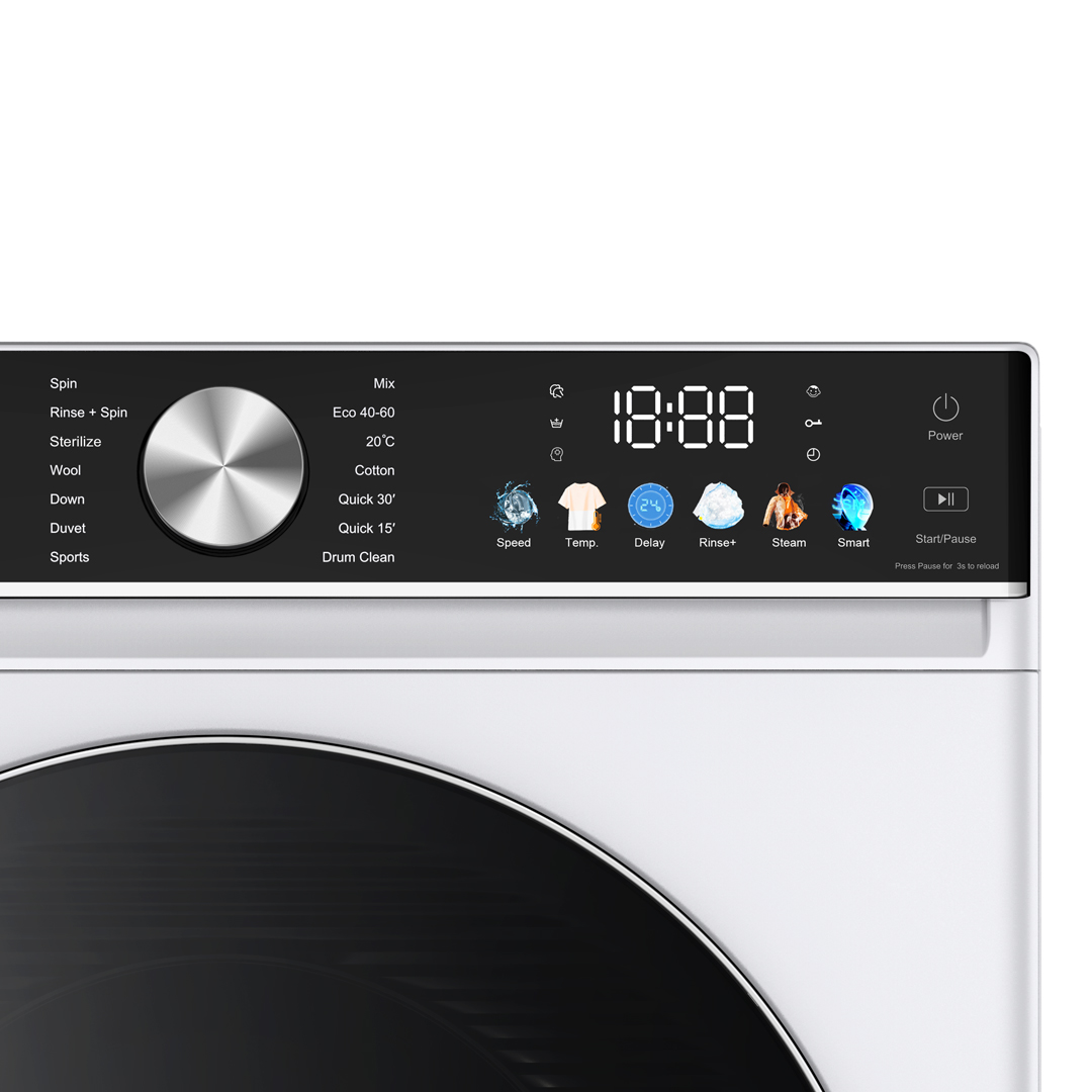 Estética blanca con puerta transparente, tambor de acero inoxidable. Sistema de control electrónico con Display LED con 14 programas de lavado y funciones para garantizar el mejor resultado y cuidado en tu colada.