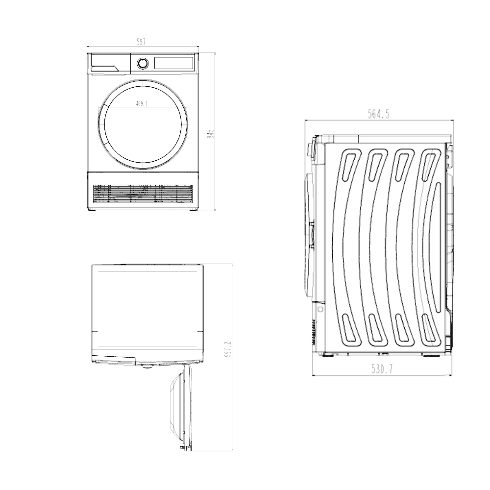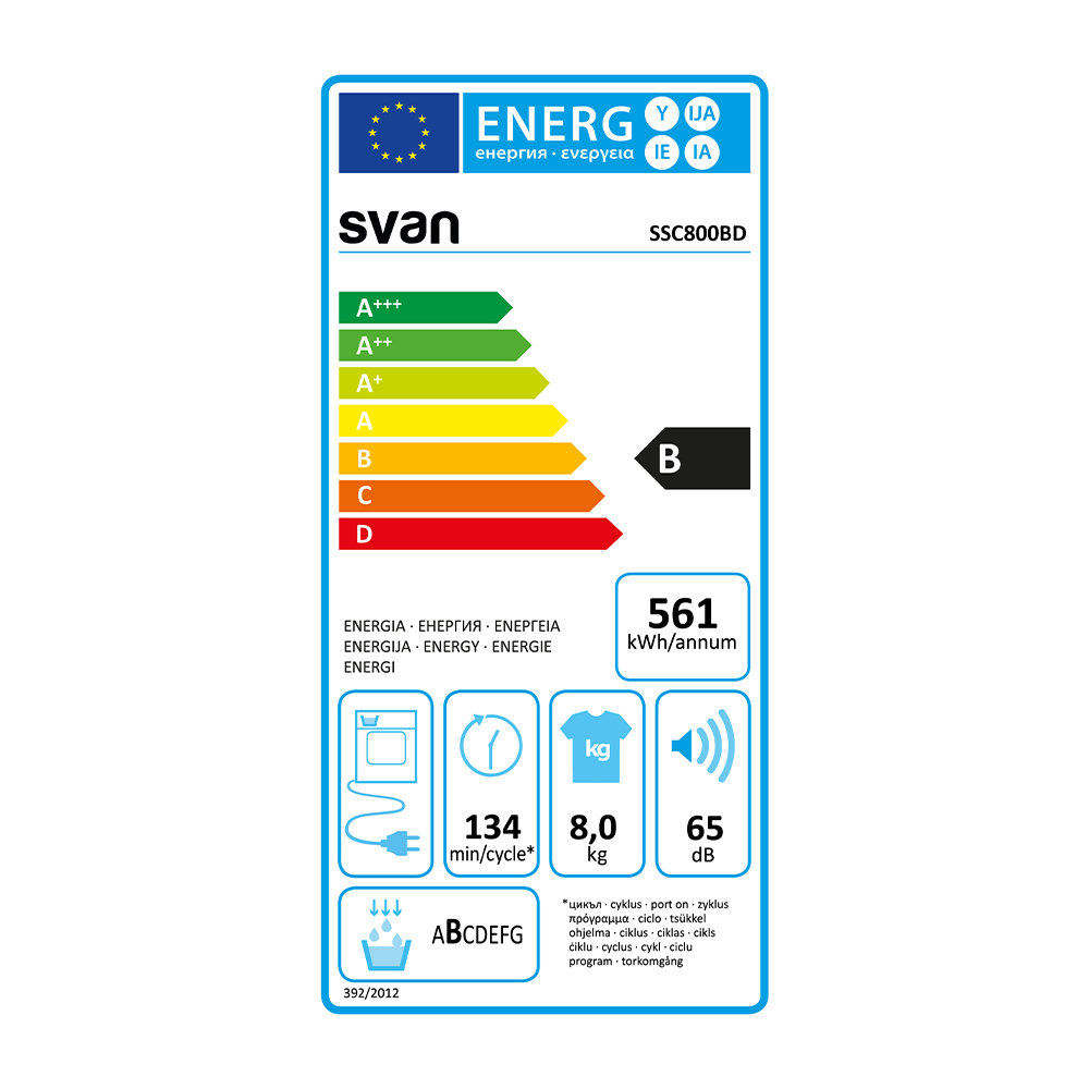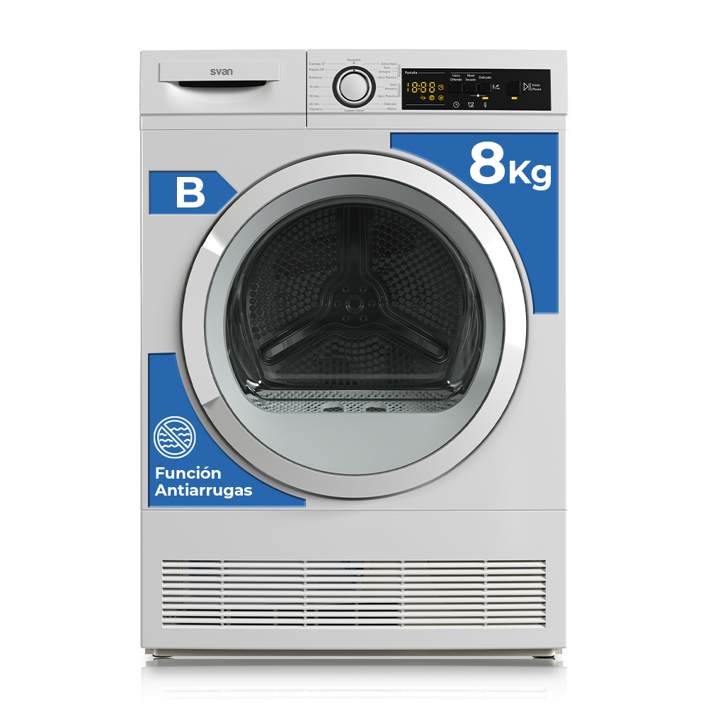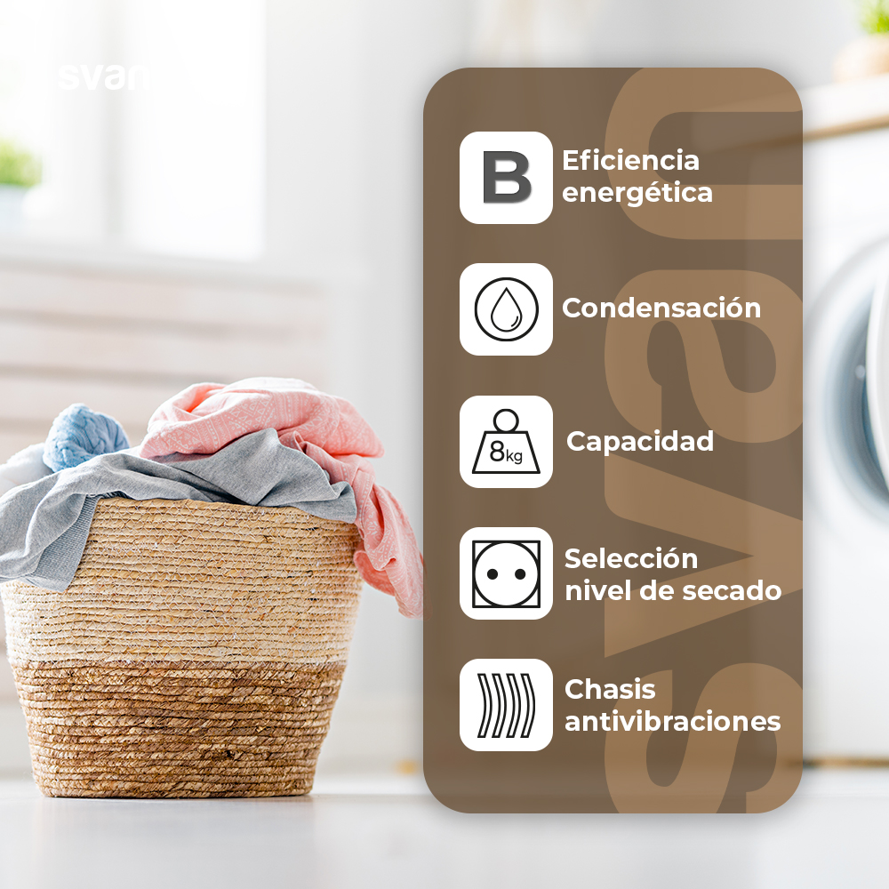 Secadora de Condensación con capacidad de carga 8 kg. Motor universal con eficiencia energética G y nivel sonoro máximo de 65 dB.